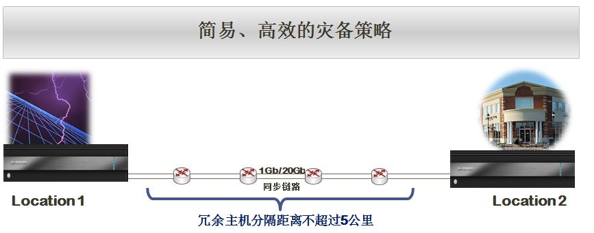 H&iSERVER容错服务器系统支持分离式(异地)部署,两个主机节点可以分配在不同的机房最多可以相隔5公里以上。避免人为因素或者自然灾害所导致的业务系统瘫痪,这个完全不同于传统的灾备方案仅仅只能做到了数据异步备份,H&iSERVER容错服务器系统实现了两个不同站点的业务系统的实时同步备份。