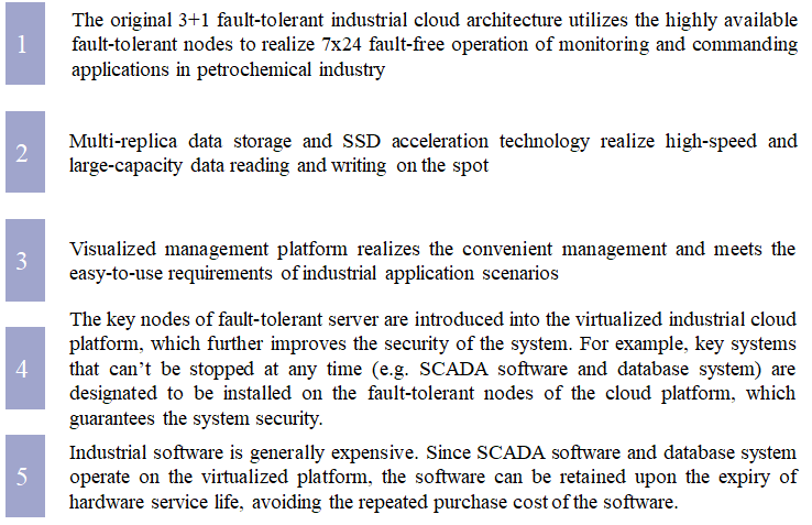HITE's petrochemical monitoring platform based on industrial private cloud and fault-tolerant server provides basic computing and management capabilities for the monitoring and commanding platform of petrochemical industry through high availability and system stability.